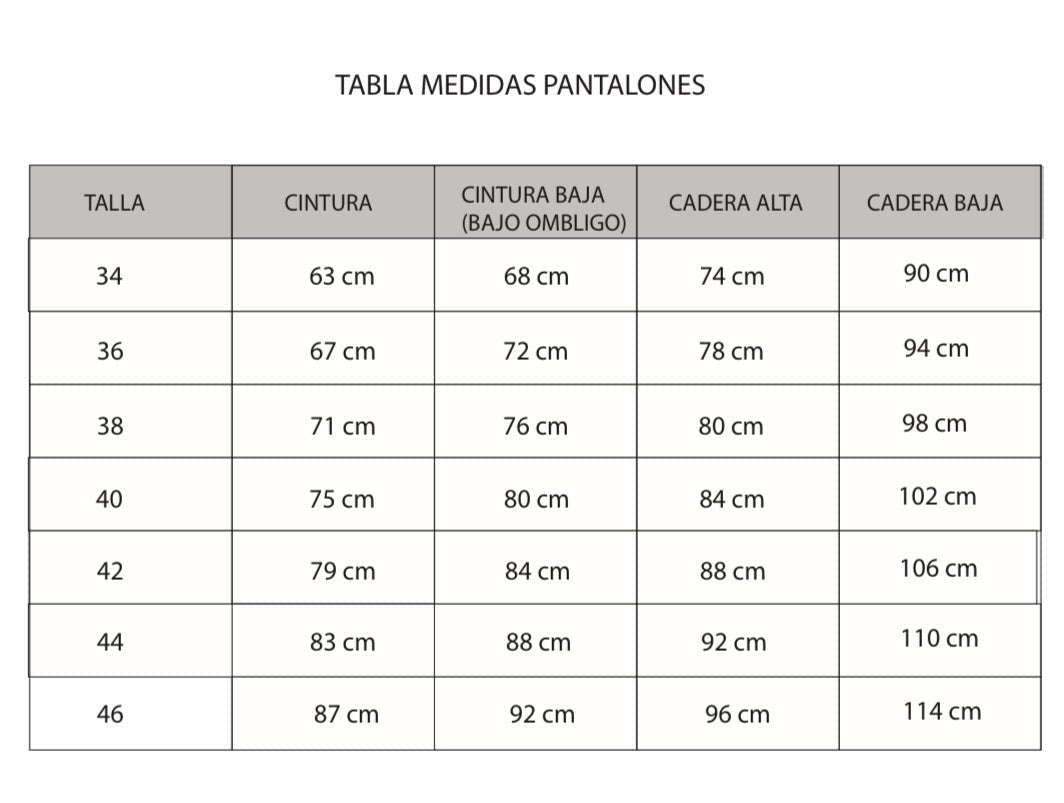 La modelo está usando una talla 36, tiene 67 cm de cintura, 72 cm de cintura baja y 96 cm de cadera.